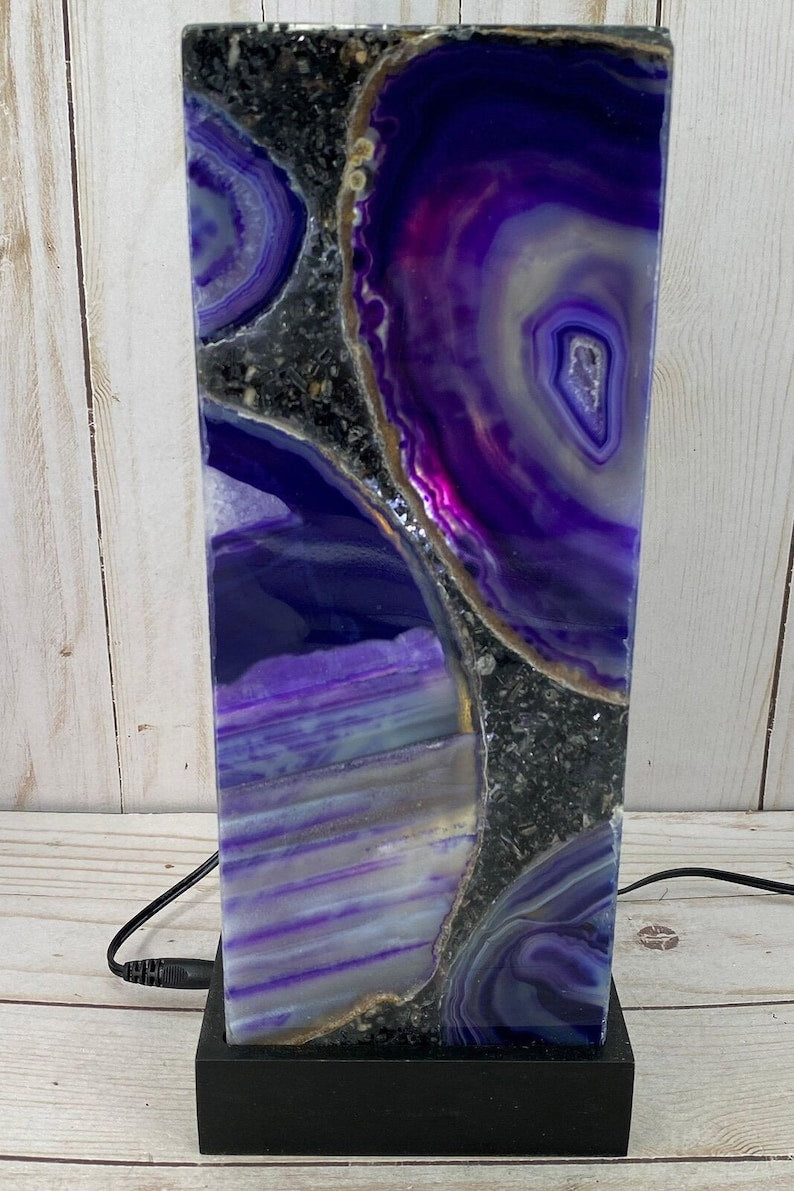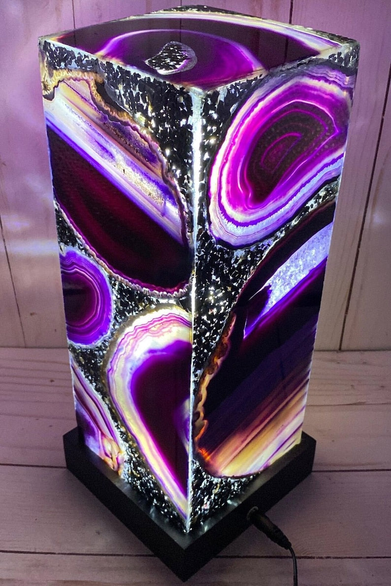 Add a touch of elegance to your home with this Handcrafted Purple Agate Resin Lamp. This stunning, inspired lamp highlights the natural beauty of purple agate patterns encapsulated in premium resin. Its unique craftsmanship creates a mesmerizing glow, making it a perfect accent piece for any room.Whether placed in your living room, bedroom, or office, this lamp offers both functionality and artistic charm. Its handcrafted design ensures every piece is one of a kind, adding a luxurious and sophisticated vibe to your decor.