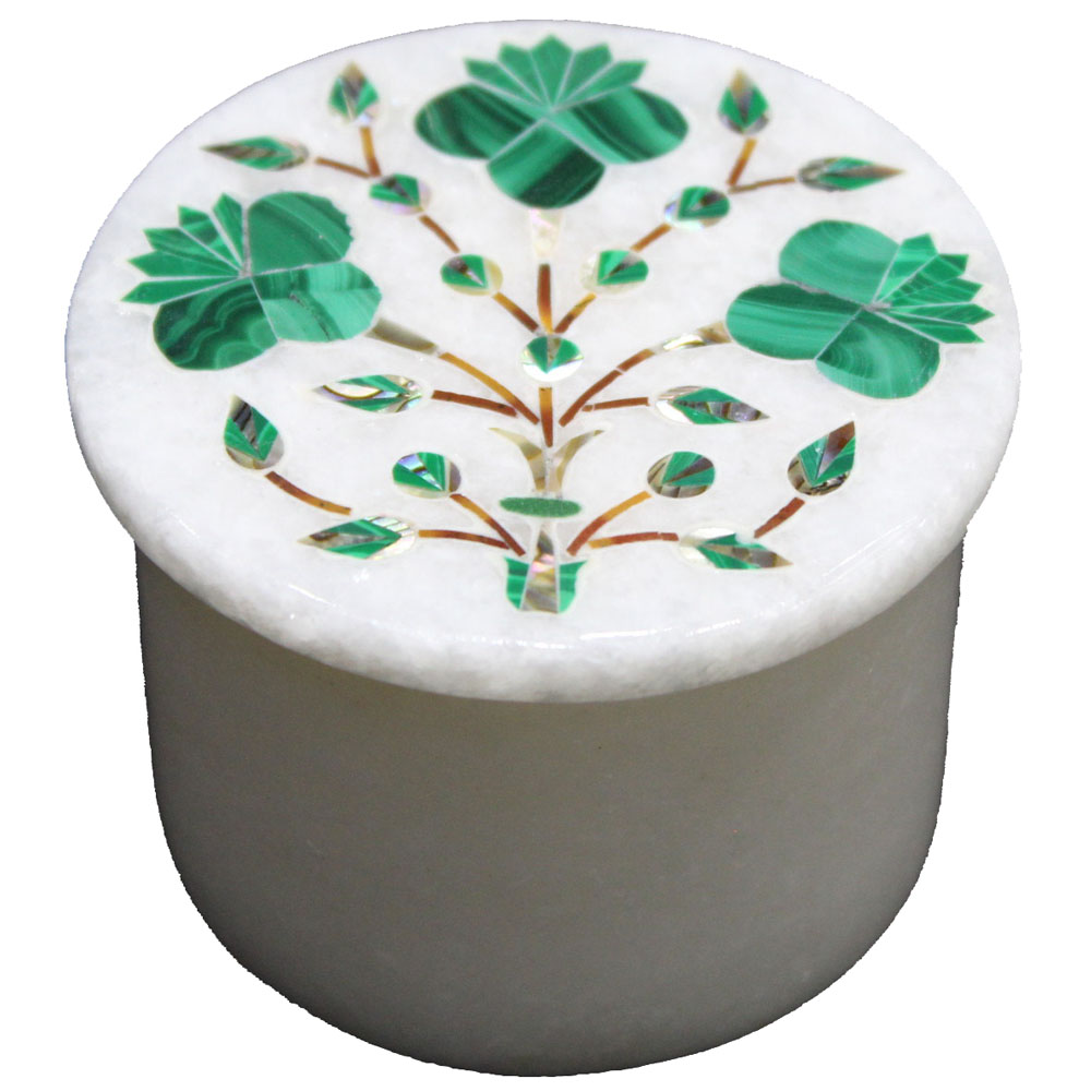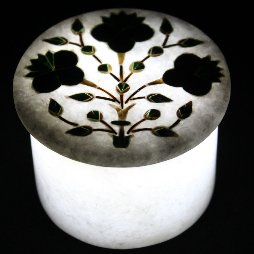 This round white marble trinket box can be used for jewelry storage & also can be used for decoration on coffee table & dressing table. This antique jewelry box illuminates if the light arrangement(Battery LED) is made under the box as you can see the beauty of light illumination in the photographs of the box. Your invaluable pieces of jewelry can now be placed in an exquisite box that will enhance the value of the jewelry and give it the respect it deserves. The versatile antique box may be used as a small jewelry box and keepsake box or presentation box.