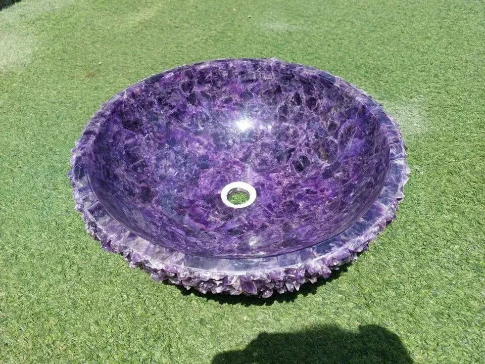 Infuse your space with elegance and healing energy with this handcrafted vessel sink made from genuine amethyst crystal. The rich purple hues and intricate crystal textures create a dramatic focal point, while the polished interior provides a smooth, functional finish. With its raw, jagged edge and shimmering natural beauty, this sink is a stunning addition to any luxury or spa-inspired bathroom.