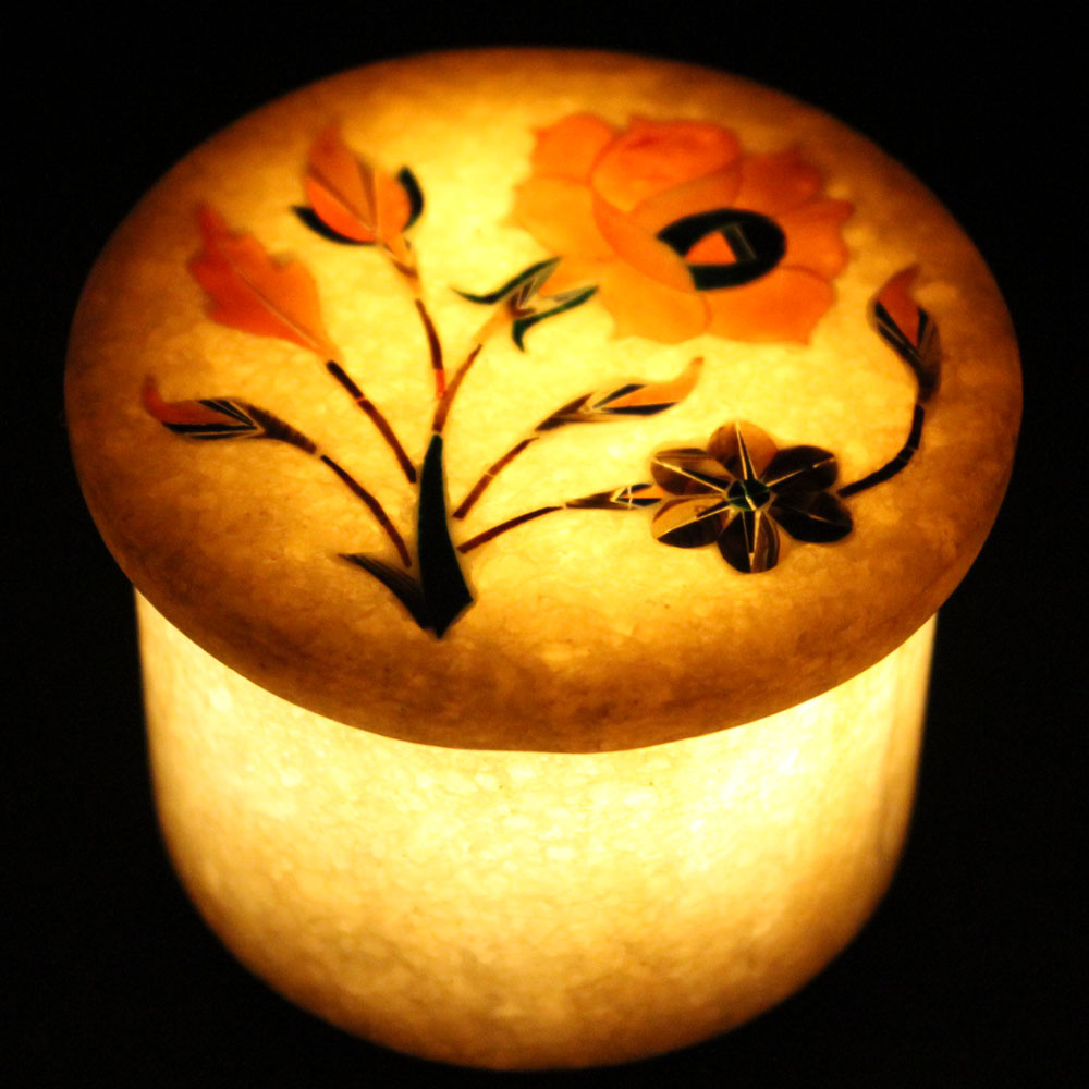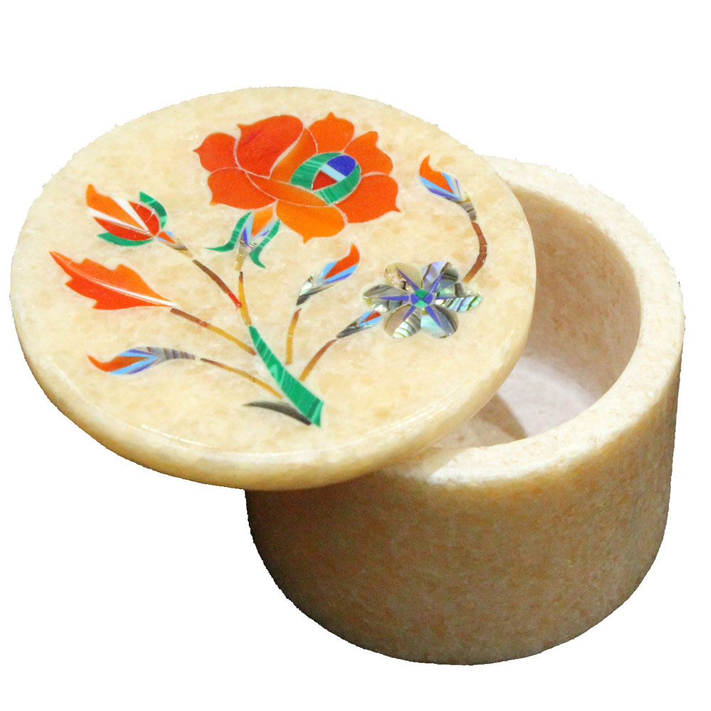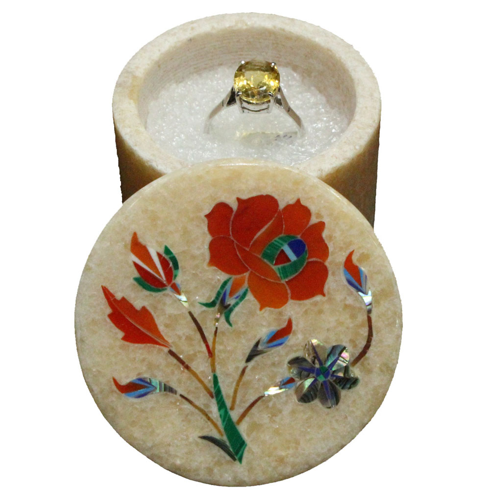 This round white marble ring holder is made from single piece of marble and its inlaid with Carnelian, Lapislazuli, Malachite, Paua Shell, Jasper and Turquoise gemstones. The round white marble ring storage box is made in Agra India & fully handmade. The white marble is from makrana it is the same place where we got the marble for the Taj Mahal in Agra India.