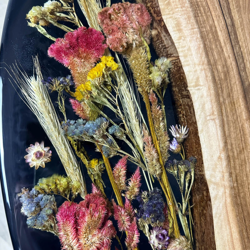 Epoxy Inlay: High-quality black resin with embedded wildflowers