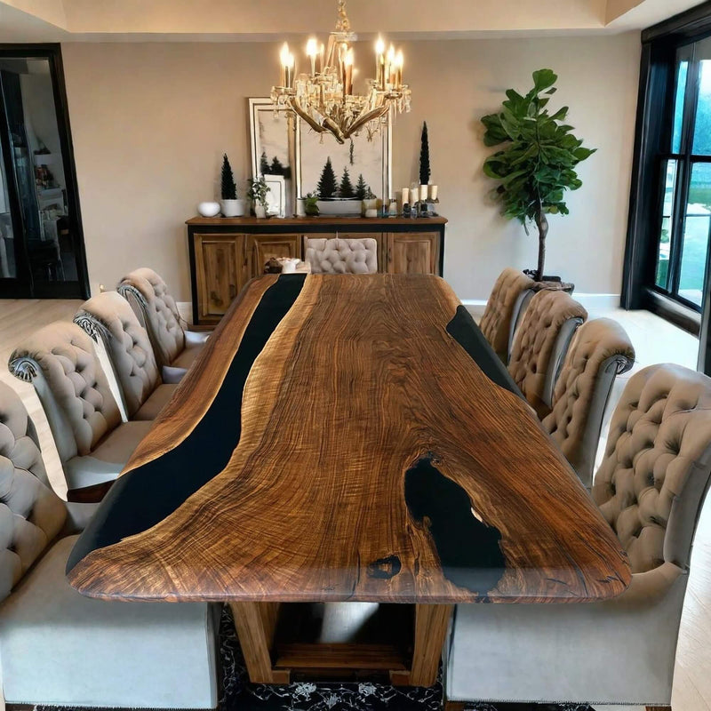 Design: Flowing black resin river accentuates the natural grain and edge of the wood