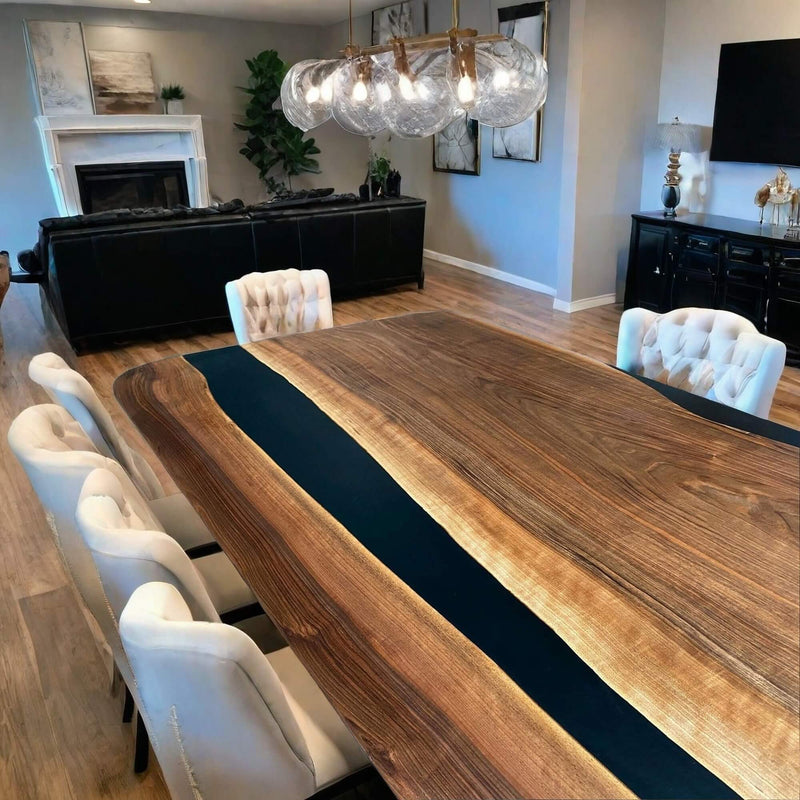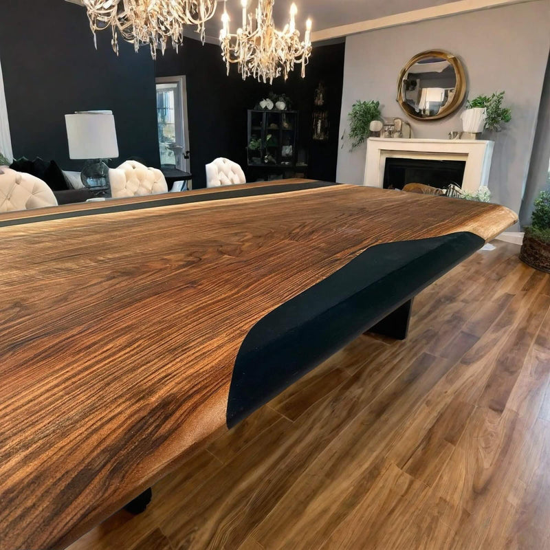 Make a bold, sophisticated statement with this Custom Live Edge Walnut Epoxy River Table, handcrafted to perfection with rich black epoxy that flows naturally between stunning slabs of premium walnut. Its sleek, dark resin complements the wood’s deep grain, while the live edge contours preserve the organic beauty of the tree.