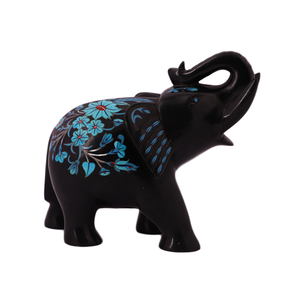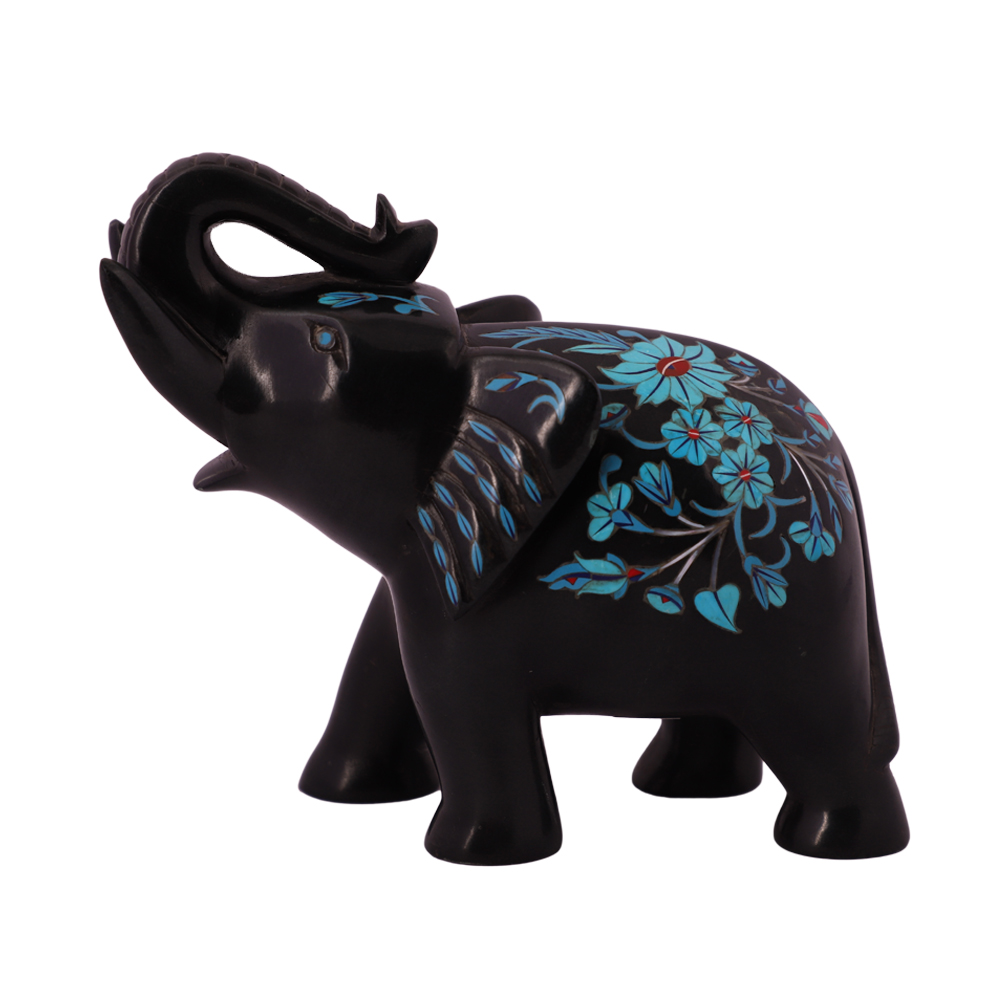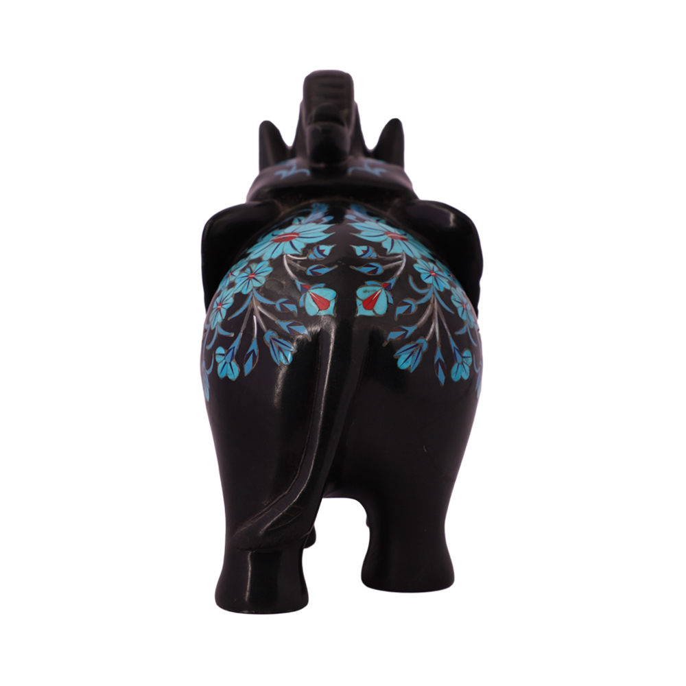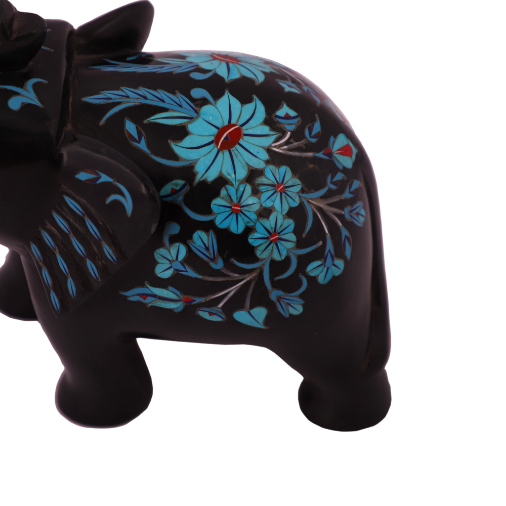 Exclusive Black Marble Elephant Statue is fully handmade inlaid with the different types of semiprecious stones. The semiprecious stone inlaid into Black Marble Elephant Statue are Mother of Pearl, Turquoise, Lapis Lazuli and Carnelian. This beautiful piece is manufactured by skill artisans in the same style and technique as The Magnificent Taj Mah