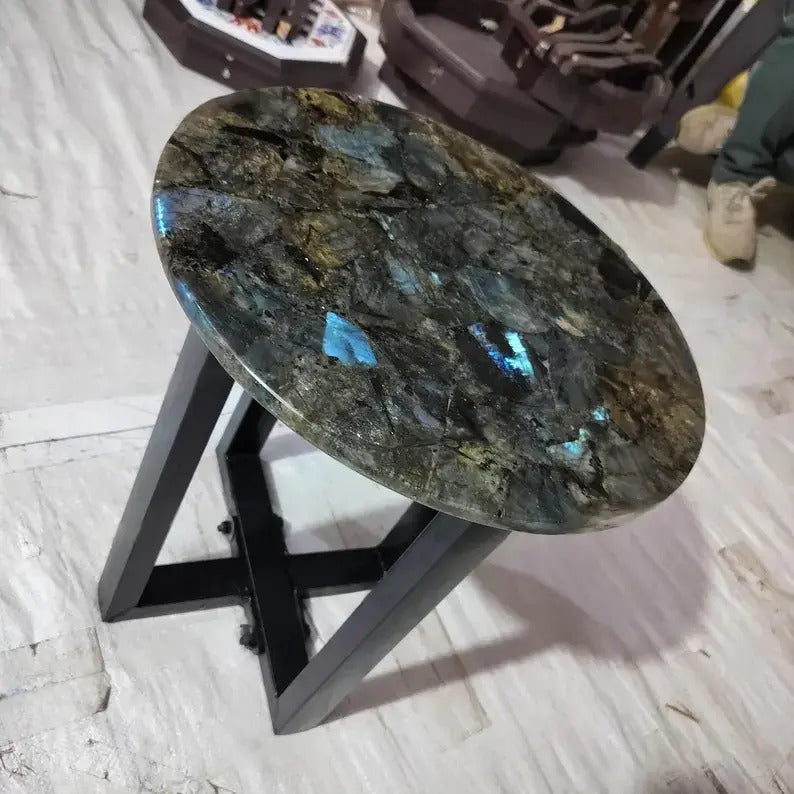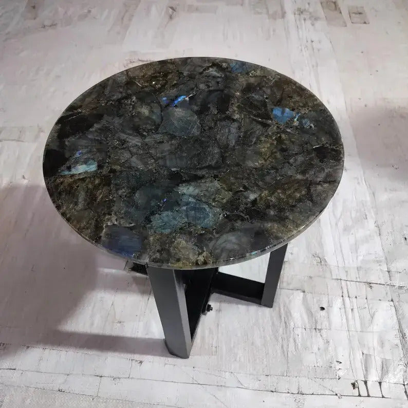 This Round Labradorite Stone Accent Table is a stunning fusion of natural beauty and modern design. The tabletop is crafted from genuine labradorite stone, known for its captivating iridescent hues and shimmering play of light. Each piece features unique patterns, making it a one-of-a-kind statement for any space. The sleek metal base provides a sturdy foundation and adds a contemporary touch, complementing the elegance of the stone top.