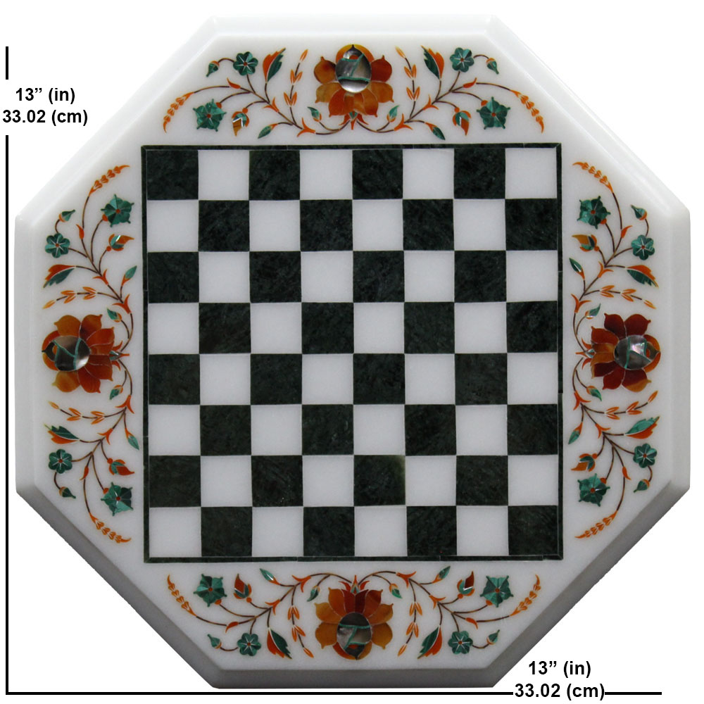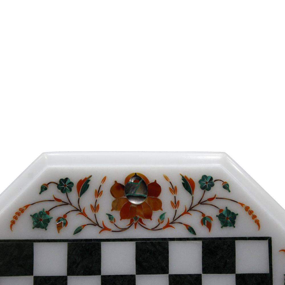 Discover the elegance of this Handcrafted Octagonal White Marble Inlay Chess Board with Wooden Base Stand. Skillfully crafted from premium white marble, the board features intricate floral inlay designs using semi-precious stones, showcasing exquisite craftsmanship. The unique octagonal shape adds a modern twist to this timeless design, while the sturdy wooden base stand ensures stability and enhances its aesthetic appeal.