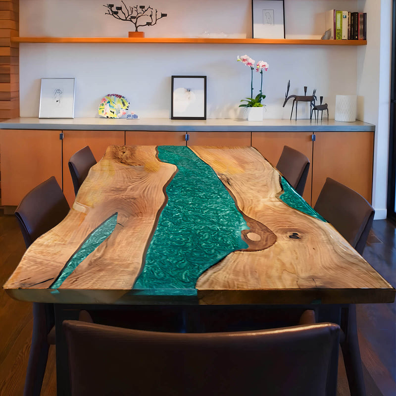 Make a bold statement in your dining room with this luxury live edge wood table featuring a vibrant emerald green epoxy river. Crafted from hand-selected slabs of natural wood, the stunning contrast between the organic grain and the high-gloss resin creates a one-of-a-kind masterpiece.