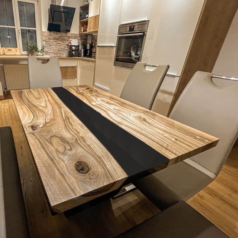 Bring warmth and sophistication into your kitchen or dining space with this Natural Edge Walnut Dining Table featuring a sleek black epoxy center. Crafted from beautifully grained walnut slabs, the table showcases swirling wood patterns and a striking, solid black epoxy river that flows seamlessly through the middle.